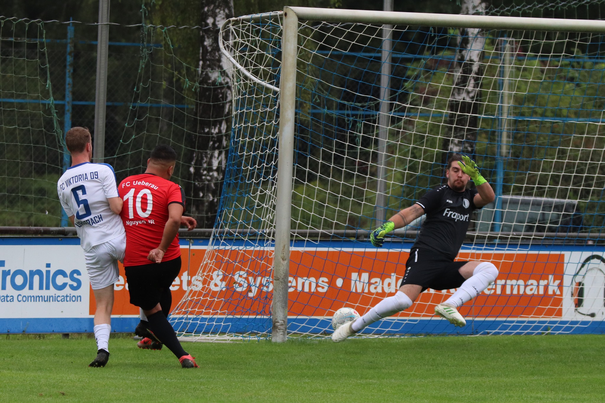 Dabei geriet man in der ersten Hälfte zunächst in Rückstand als eine lange Flanke von Ueberaus über Keeper Chris Mickler ans Lattenkreuz ging und von dort aus Jonni Nguyen vor die Füße fiel, der zum 1:0 für die Gäste vollendete (10.). Es folgten mehrere gute Angriffe des FC Viktoria über die Außenbahn-Spieler Lukas Esser und Marcel Spanheimer sowie Sinan Cetinkaya in der Sturmspitze. Phasenweise spielte nur noch die Viktoria.