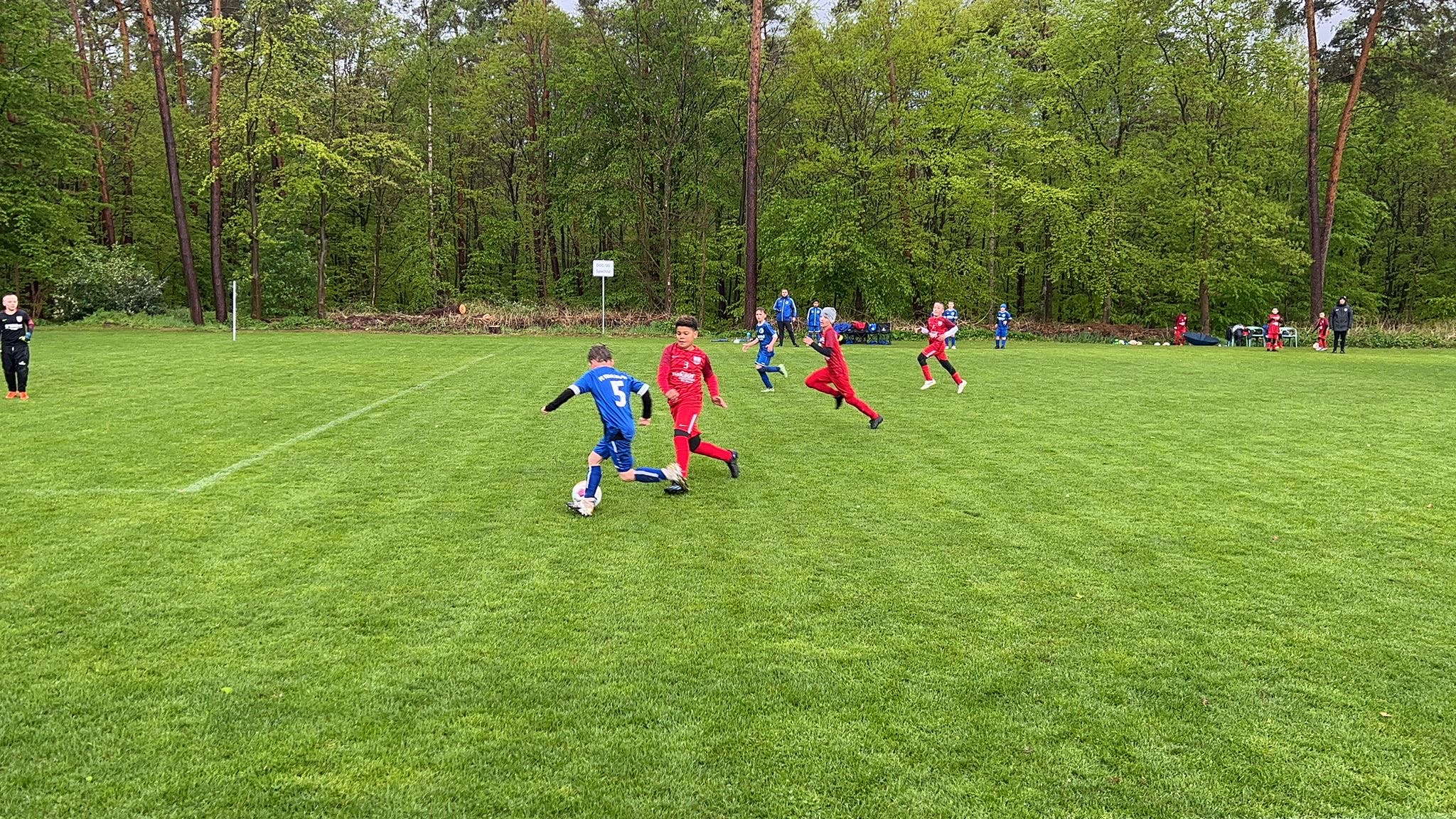 Bereits in der 3. Spielminute wurde der Torreigen durch das 1:0 von Iason Gunkel eröffnet. Von da an ging es Schlag auf Schlag, beide Seiten schenkten dem Gegner nichts. Sechs Minuten später der Ausgleich zum 1:1, gefolgt vom 2:1 durch Finn Meisel wenige Augenblicke später. Beide Mannschaften spielten von Beginn an auf Augenhöhe und weitere Tore fielen bei strömendem Regen im Minutentakt. So gingen beide Mannschaften mit einem Halbzeitstand von 5:4 in die Pause.