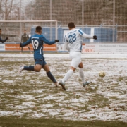Dank Anstrengungen am Sonntagmorgen fand das Spiel trotz Schnee auf dem Platz statt. Auch einige Fans ließen sich von der Kälte nicht abschrecken. Sie sollten dann auch nicht enttäuscht werden, die Partie benötigte definitiv keine Zeit, um aufzutauen. Schon in der dritten Spielminute hieß es Strafstoß für die Blauweißen, nachdem Dennis Borchardt bei einem Eckball zu Fall gebracht worden war. Kapitän Dennis Ankenbrand verwandelte am zweiten Wochenende in Folge sicher.