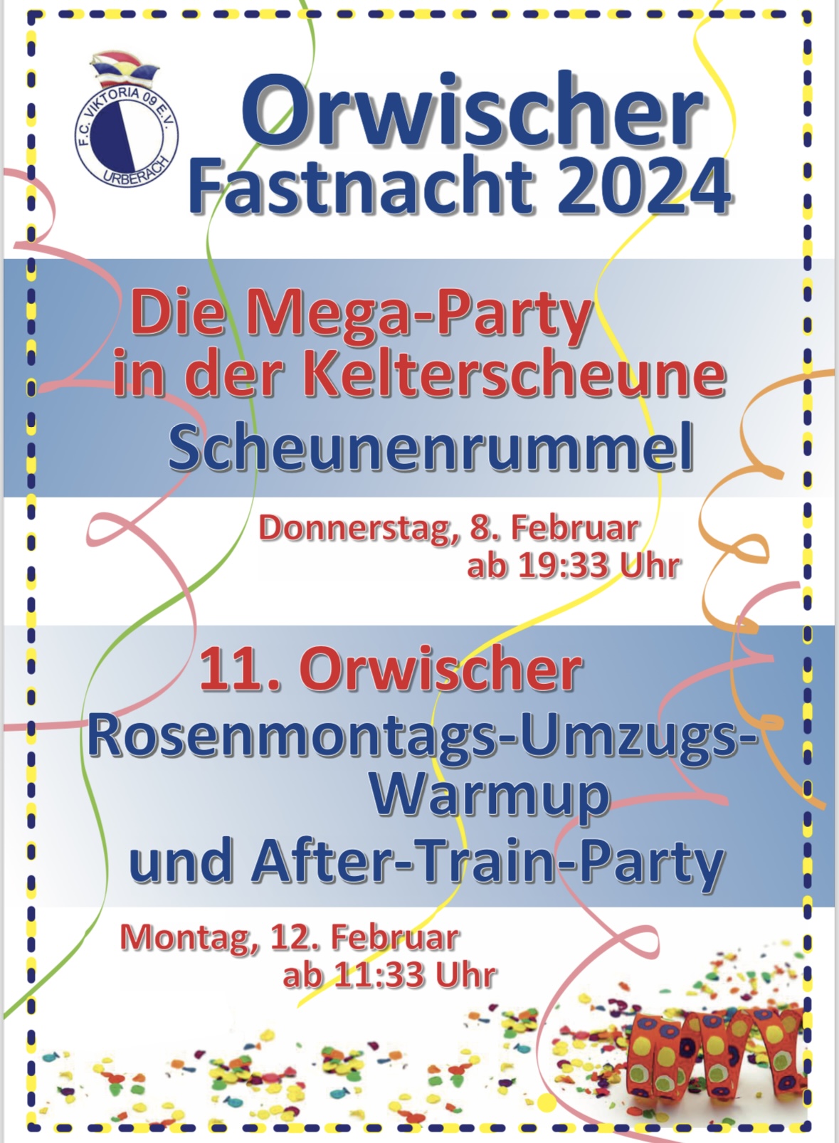 Die närrischen Tage 2024 feiert der FC Viktoria traditionell in der Kelterscheune an Weiberfastnacht und Rosenmontag.