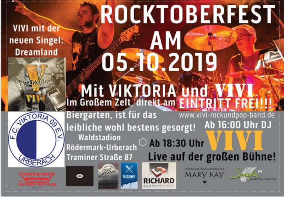 Am Samstag, den 5. ROCKtober lädt der FC Viktoria alle Mitglieder, Fans und Freunde zum großen ROCKtoberfest mit VIVI Rock & Pop ins Urberacher Waldstadion ein.
