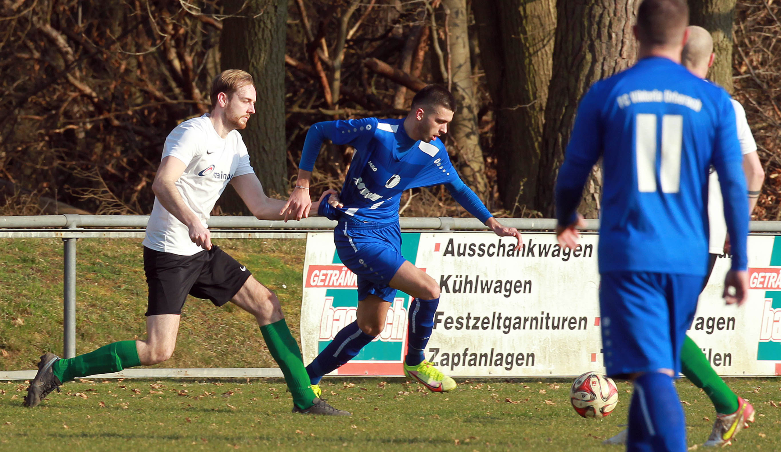 Kalt erwischt wurden die Blauweißen bereits in der 3. Spielminute als Mosbachs Top-Torjäger Marvin Bernhard zur 1:0-Führung für die Gäste traf. Danach verpasste es die Viktoria nach einem Einwurf und der daraus entstandenen Situation vor dem Tor Kapital zu schlagen und im Gegenzug erzielte die SG das 2:0 nach einem Konter durch Nikita Aman nach Vorlage von Bernhard (21.). Noch vor der Pause erhöhte dann wieder Bernhard auf 3:0 (45.+2).