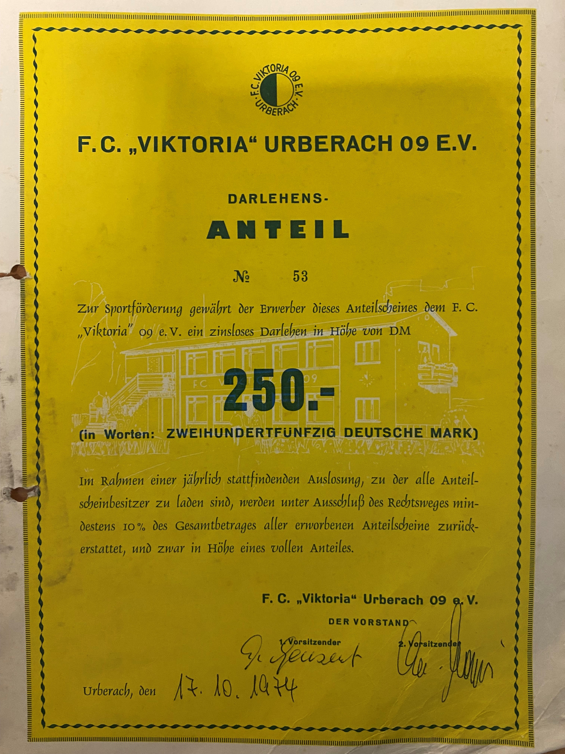 Im Oktober vor 47 Jahren stellte der FC Viktoria zur Finanzierung seines neuen Clubheims Anteilsscheine in Höhe von 250 D-Mark aus.